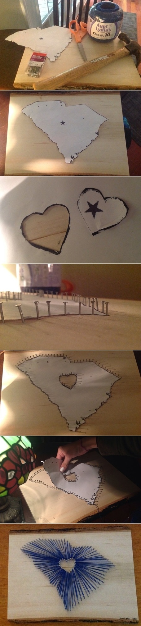 In addition to looking great on your own walls, this idea would make an excellent gift for a housewarming or going away party. You can also use the same process with outlines of things besides states, but personally I’m smitten with the love-my-hometown concept. You could even take this a step farther by Mod Podging a photo inside of the heart!